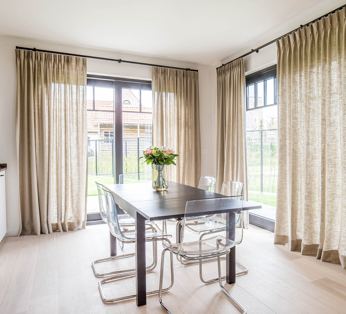 We kwamen ze vroeger wel vaker tegen, de klassieke transparante gordijnen. Ze laten veel licht binnen en je kan er met moeite doorheen. Ga voor de transparante gordijnen met bredere golven, het dempt het geluid maar oogt ook een stuk moderner. Bovendien geeft het ook rust in een ruimte. Zeker wanneer het wind zachtjes binnen waait en de gordijnen tot beweging brengt.